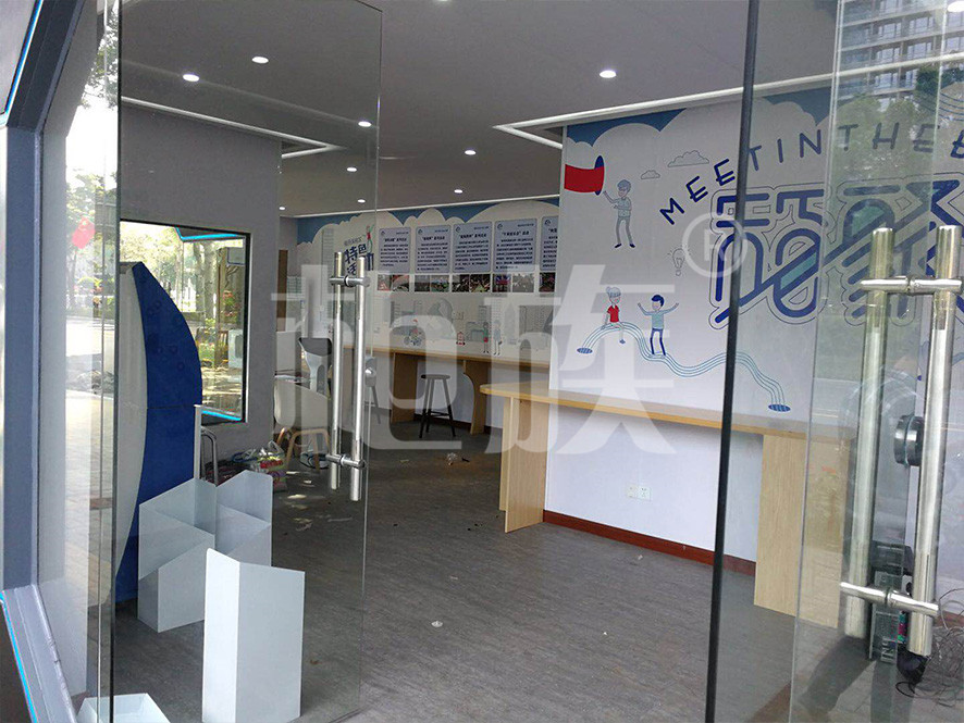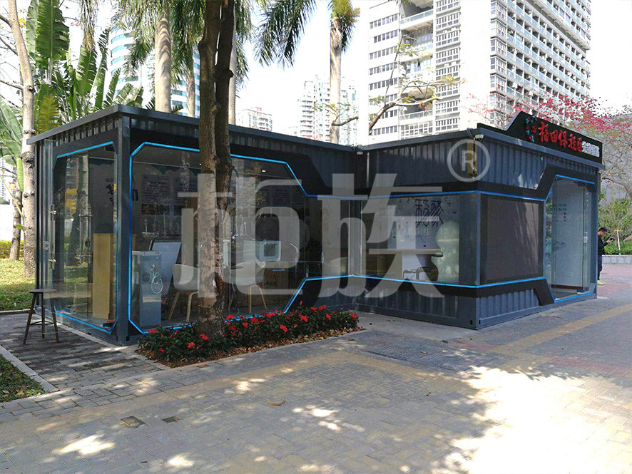 驛站使用兩個(gè)集裝箱錯(cuò)位串聯(lián)而成,正面墻體使用大面積玻璃門窗,線條流暢、造型時(shí)尚、通透亮堂,很好的突出了驛站的標(biāo)志性與開放性的特點(diǎn)。